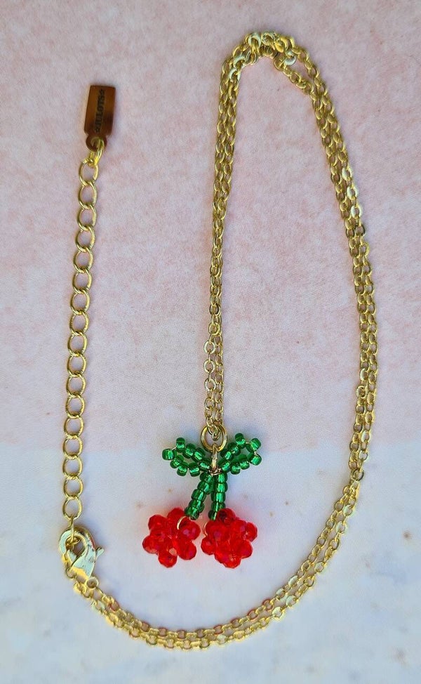 Ketting van koper gold plated, met eraan een bedeltje van kraaltjes van glas in de vorm van