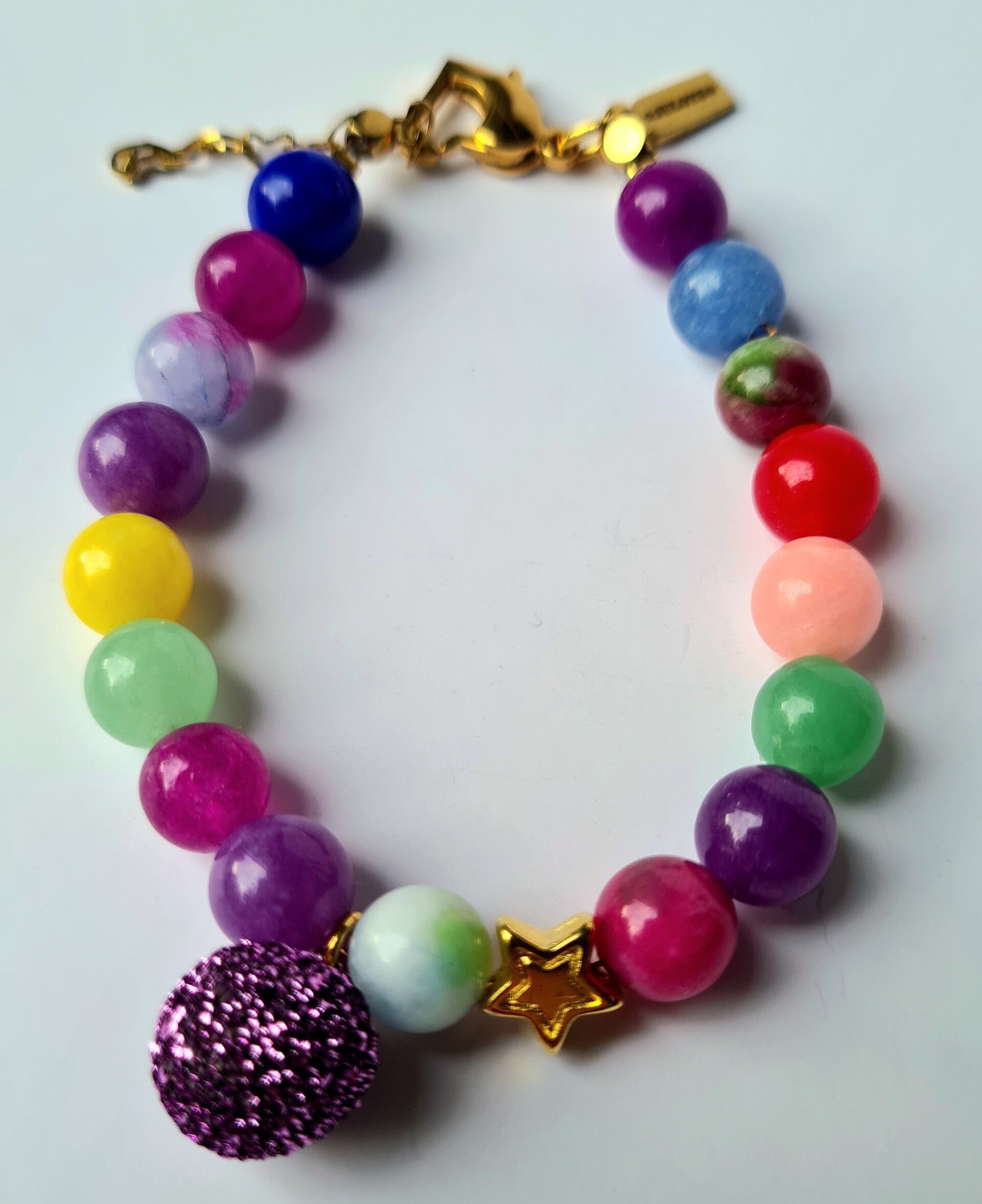 Armband met natuursteen kralen van Jade in diversen toffe kleuren. Ertussen een ster☆ en eraan een glitterpompom balletje. Iedere armband is uniek van kleurcombi.
