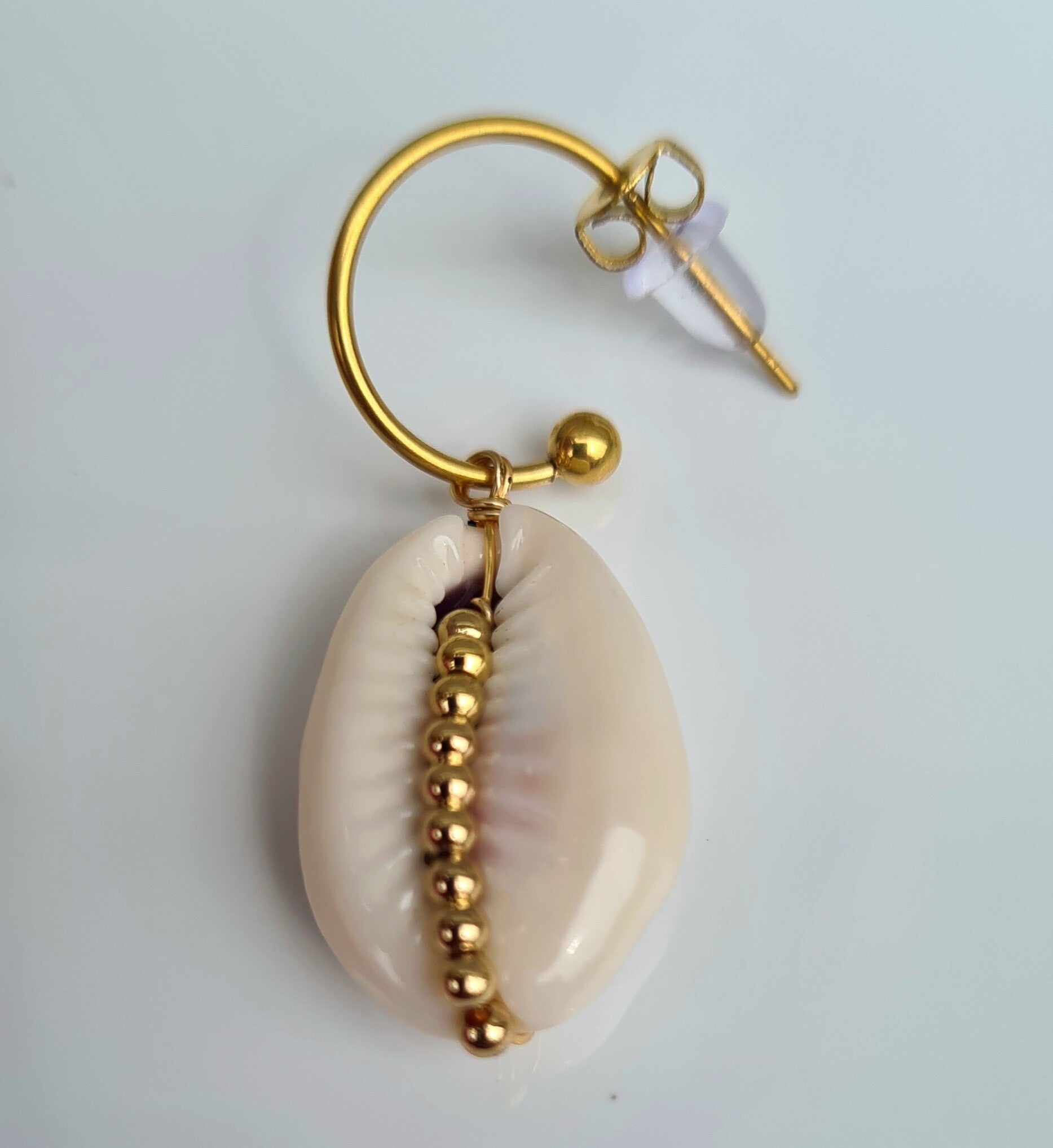 Oorbel creool met eraan een natuur schelp met golden kraaltjes detail. (Iedere schelp is anders)