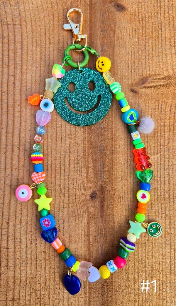Grote plexi glitter smiley met heel veel soorten kralen en bedels eraan.