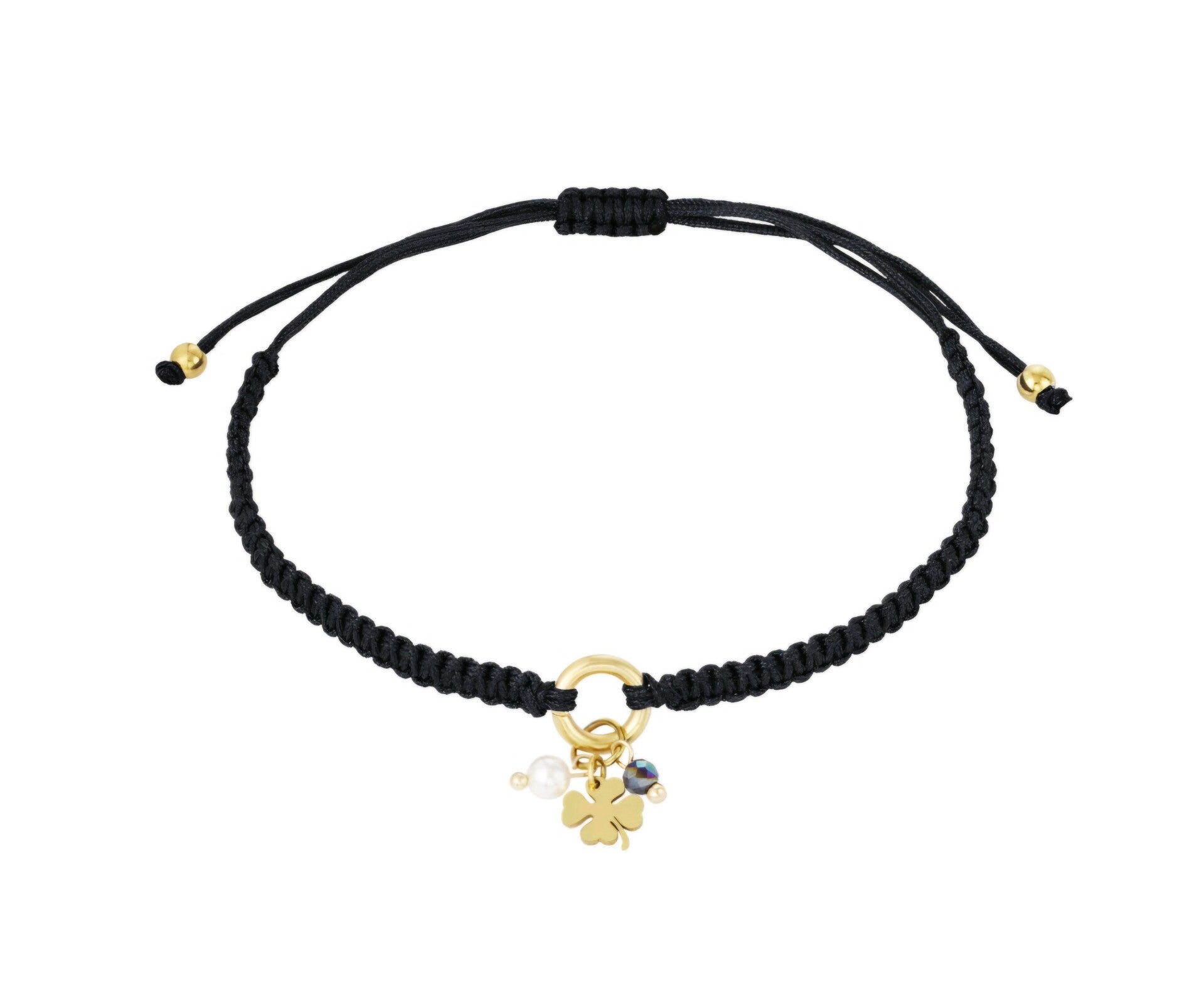 Aantrekarmband van gevlochten polyester koord, kristal kraaltje, imitatie parel en. Stainless steel klaver bedel.