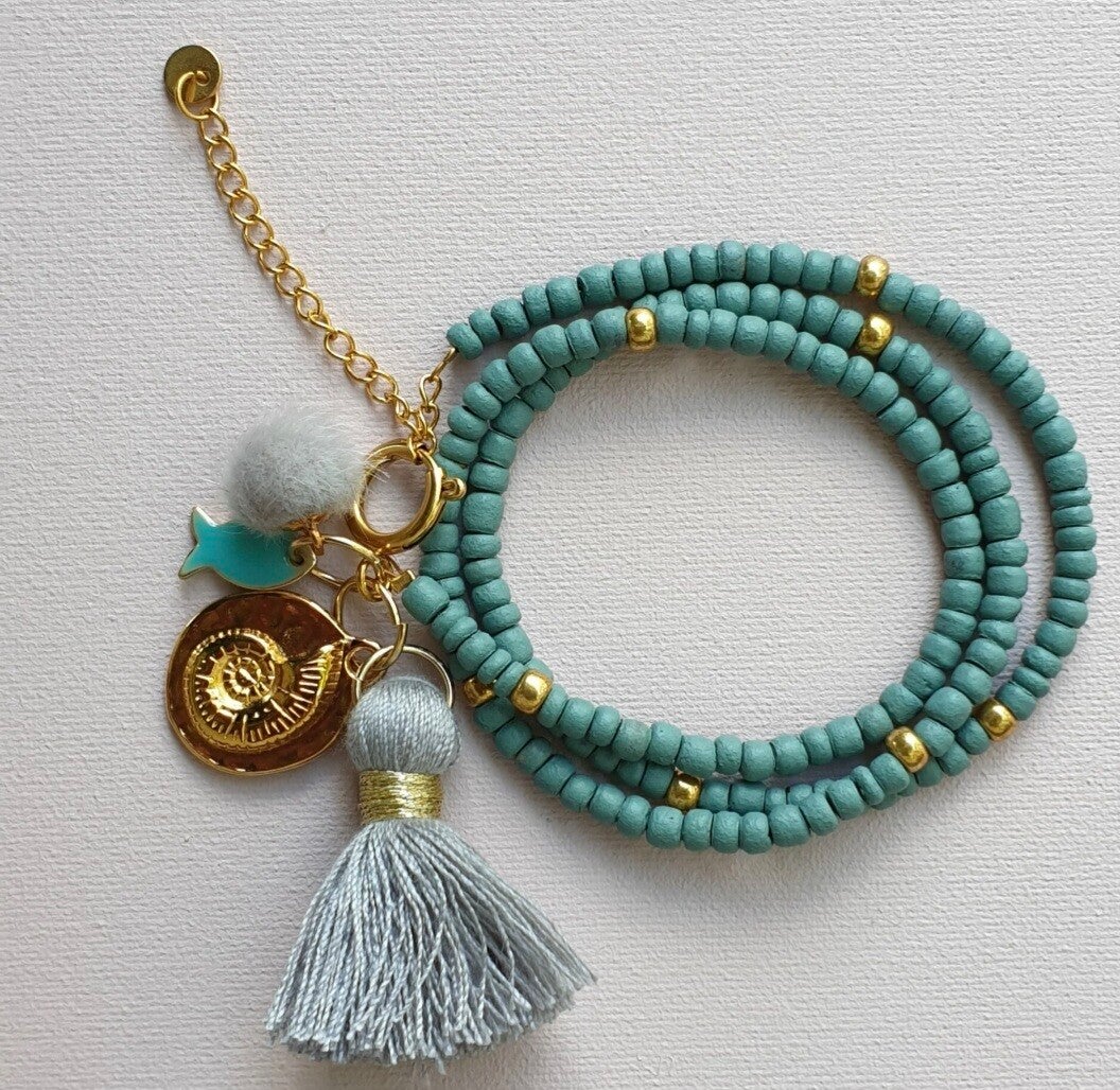 Armband van kokoskralen met gold rocailles ertussen.