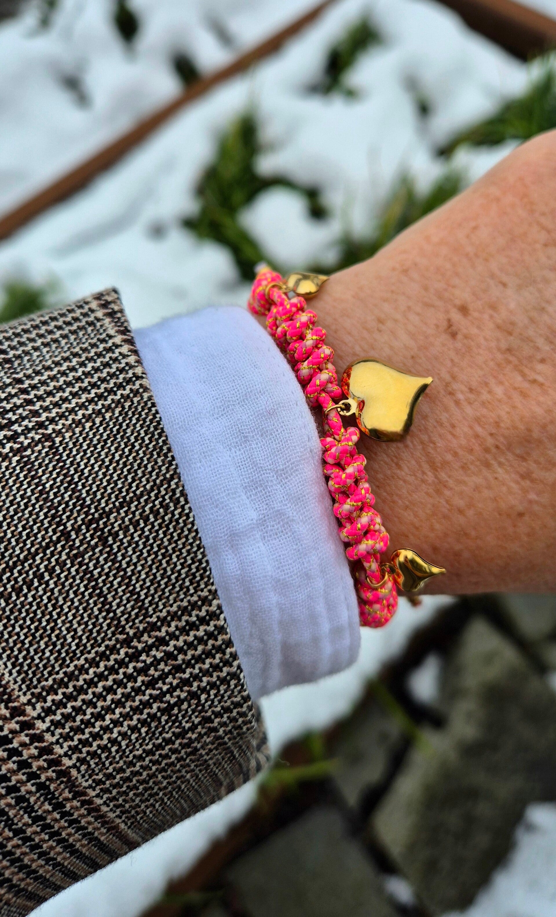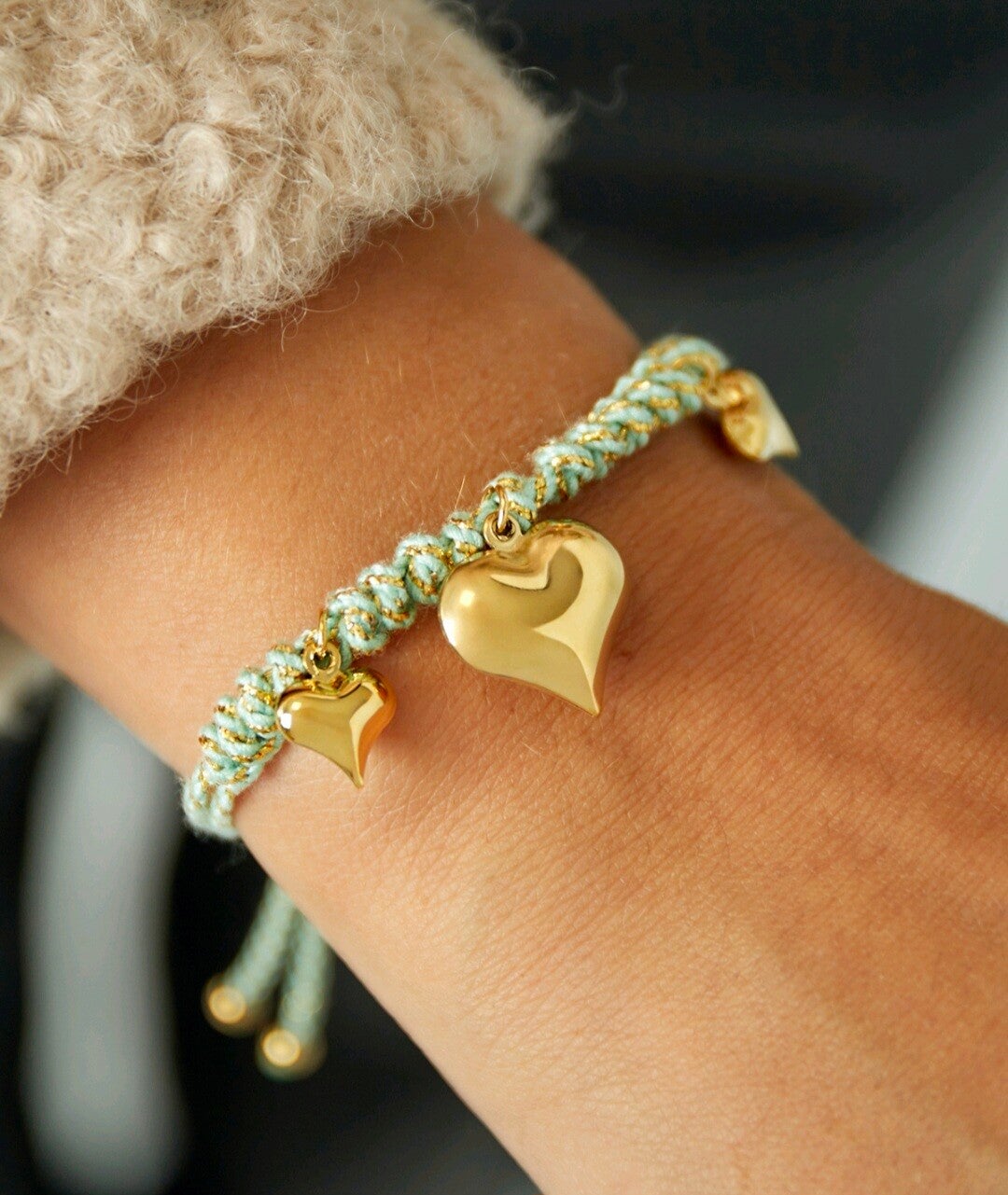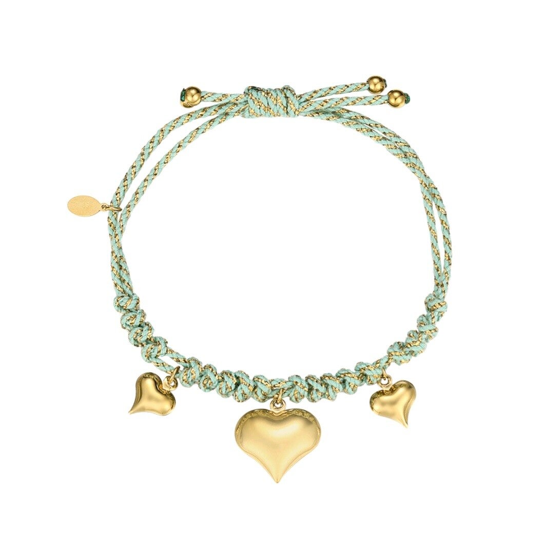 Geknoopte aantrekarmband met eraan 3 hartjes.