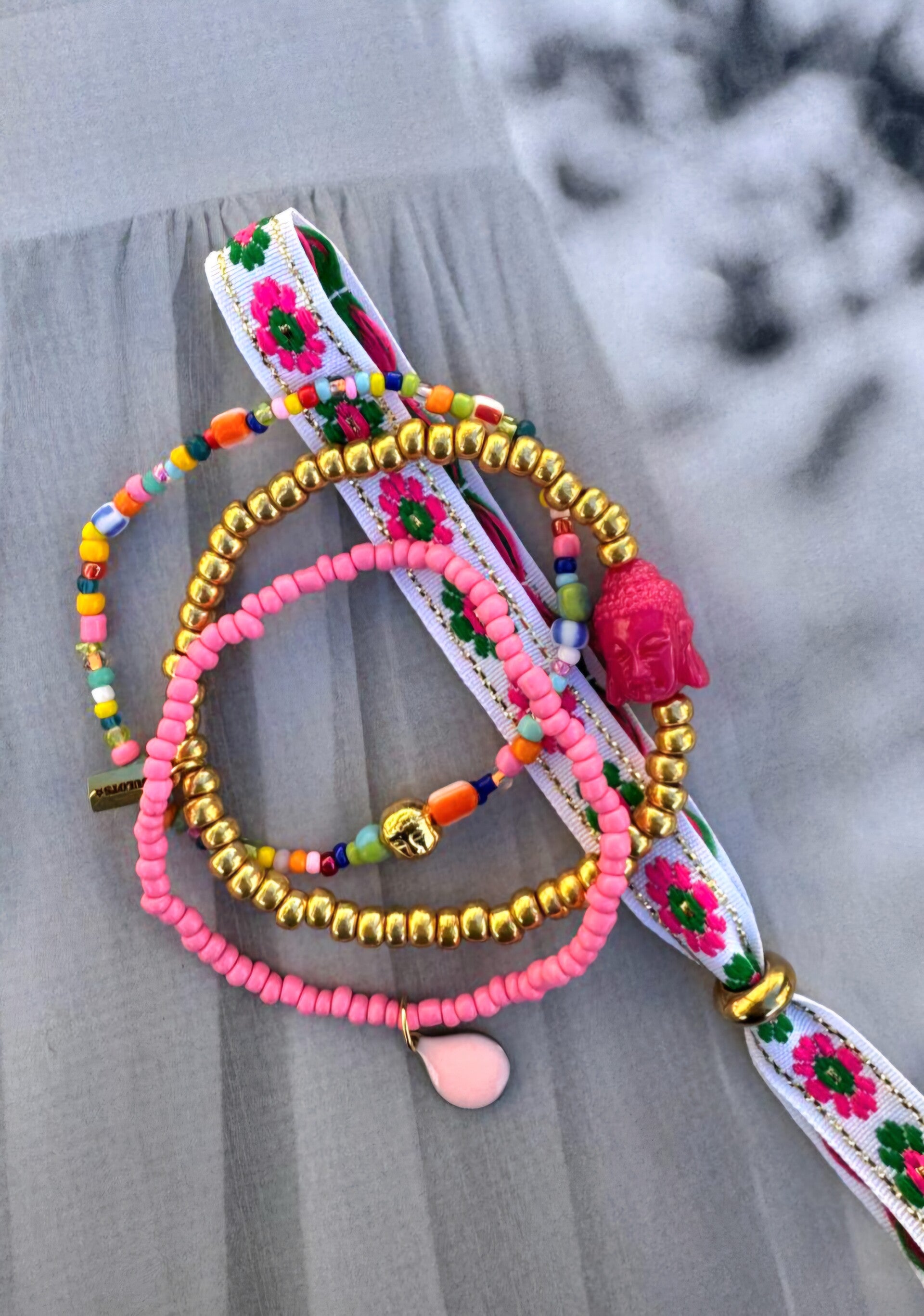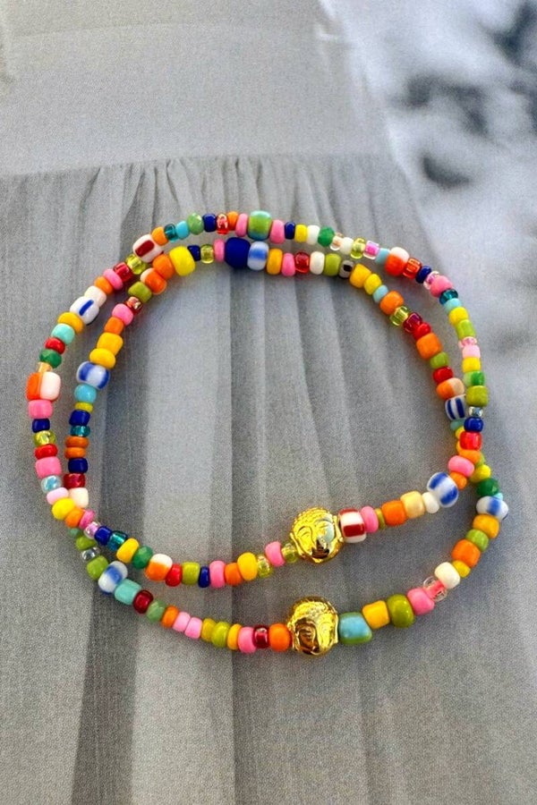 *gekleurde rocailles met boeddha gold ertussen.