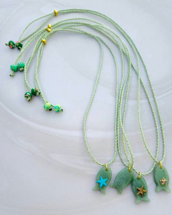 Aan de ketting een visje van natuursteen kwarts, jade groen.