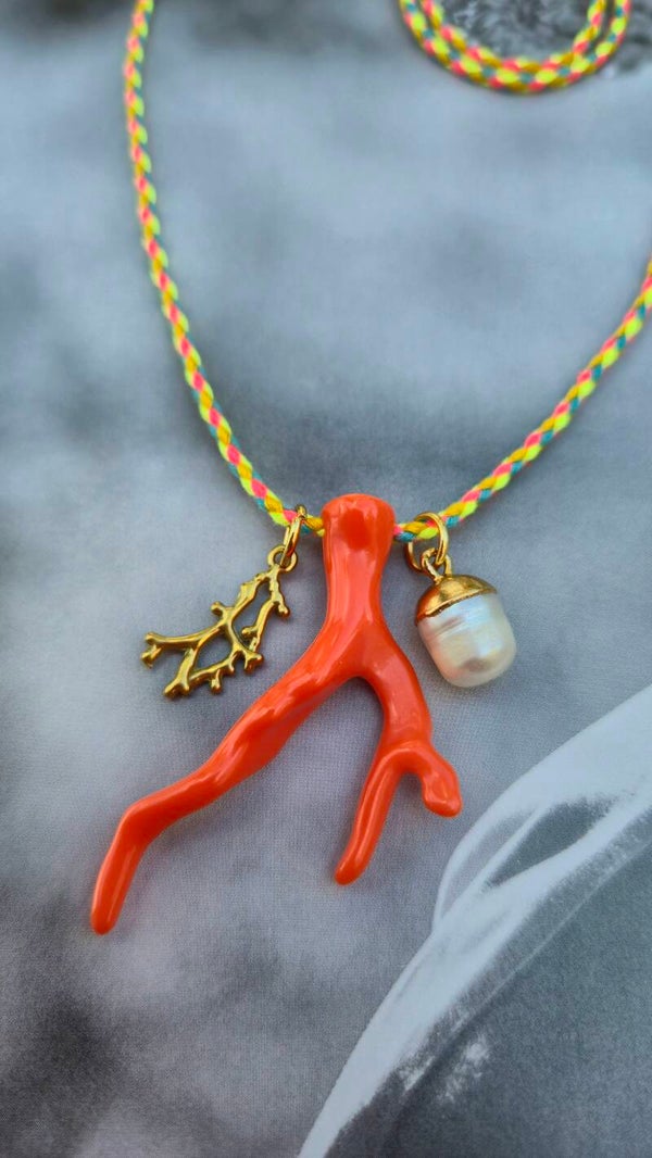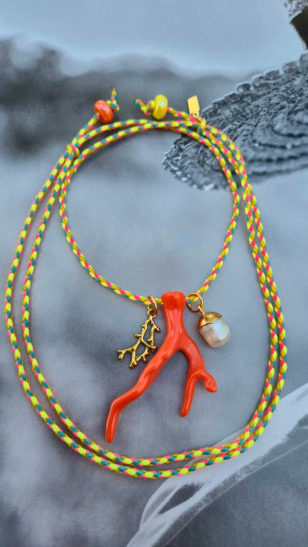 Aan het koord een koraal van acryl in groen of oranje.