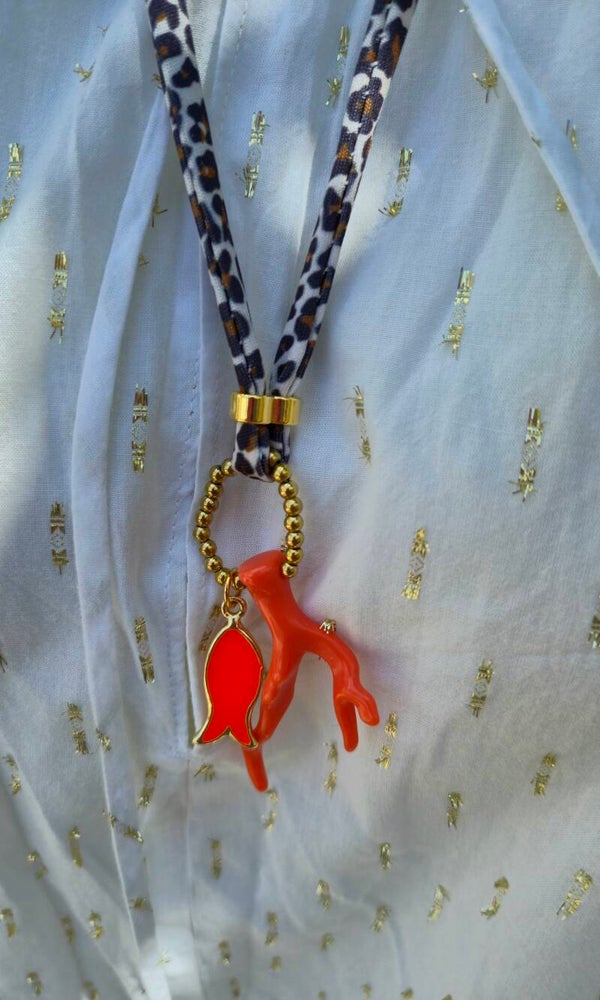 De koraal is met een kettinkje van kleine hematite kraaltjes.