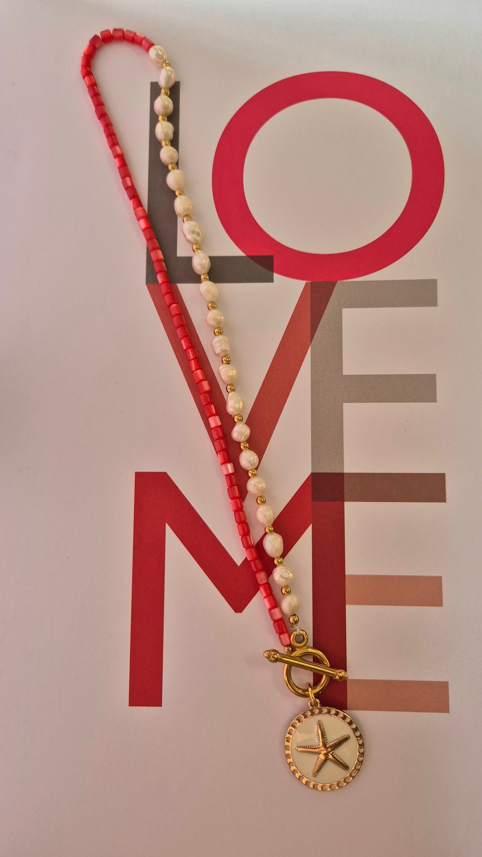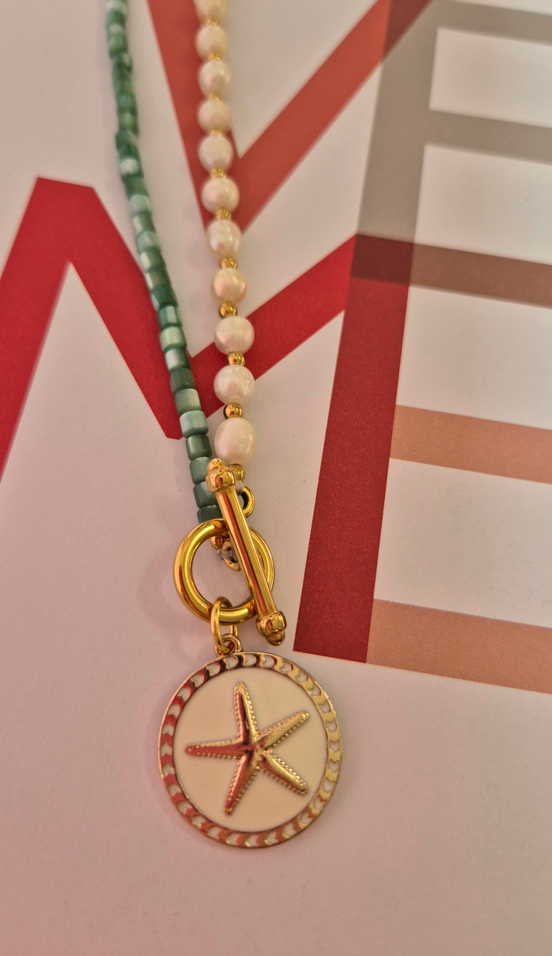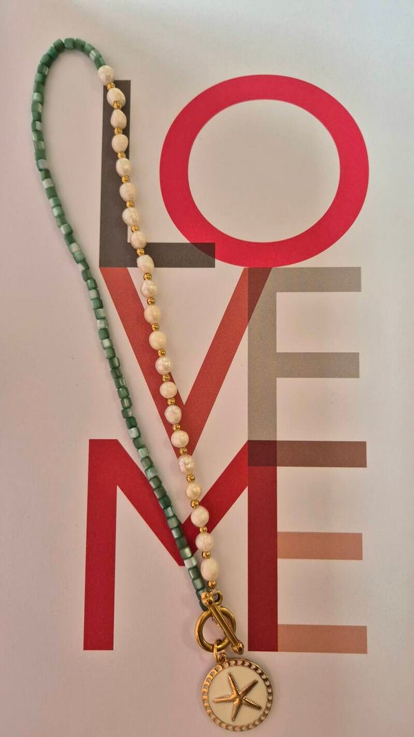 De ketting sluit met opvallend slot met eraan een geëmailleerde bedel met zeester detail.