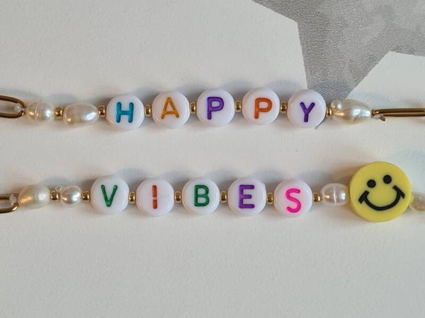 Ketting is van RVS (blijft mooi en verkleurd niet)ertussen pareltjes letters en smiley : )
