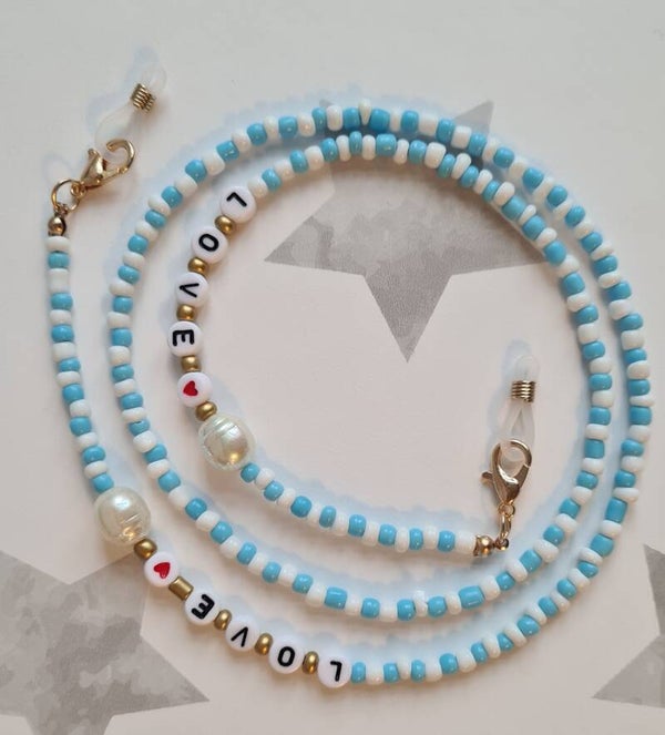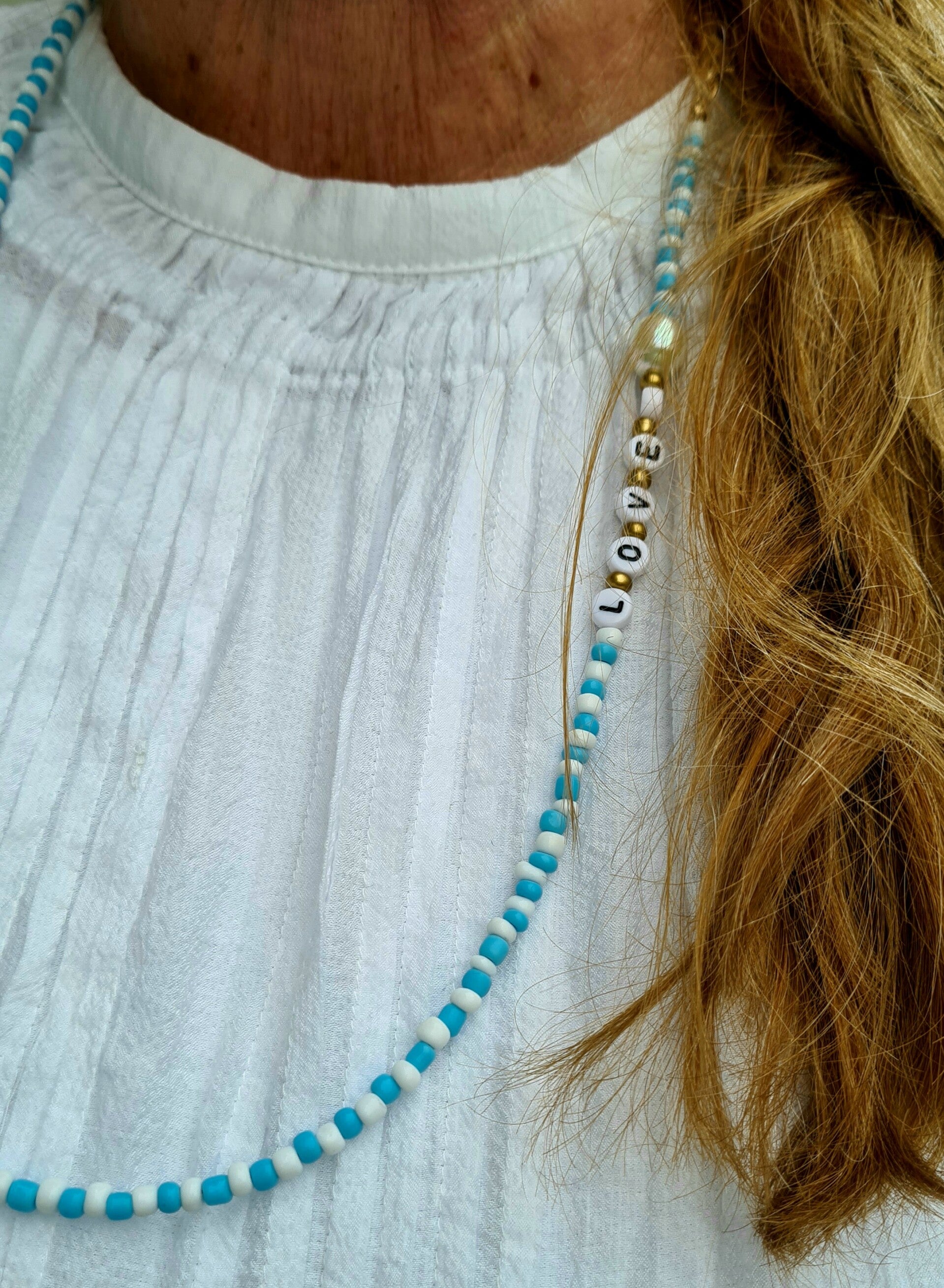 Stylish ketting van kleurrijke kralen, parels en letters met de tekst : LOVE